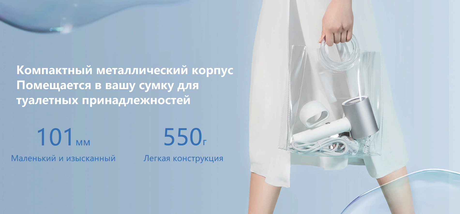 Ультракороткий цилиндрический корпус маленький и изящный, что позволяет легко упаковывать и носить его с собой, когда вы идете по делам или путешествуете. Его компактная и легкая конструкция не утомит вашу руку после сушки феном. Отделка из анодированного алюминиевого сплава придает фену привлекательную текстуру.